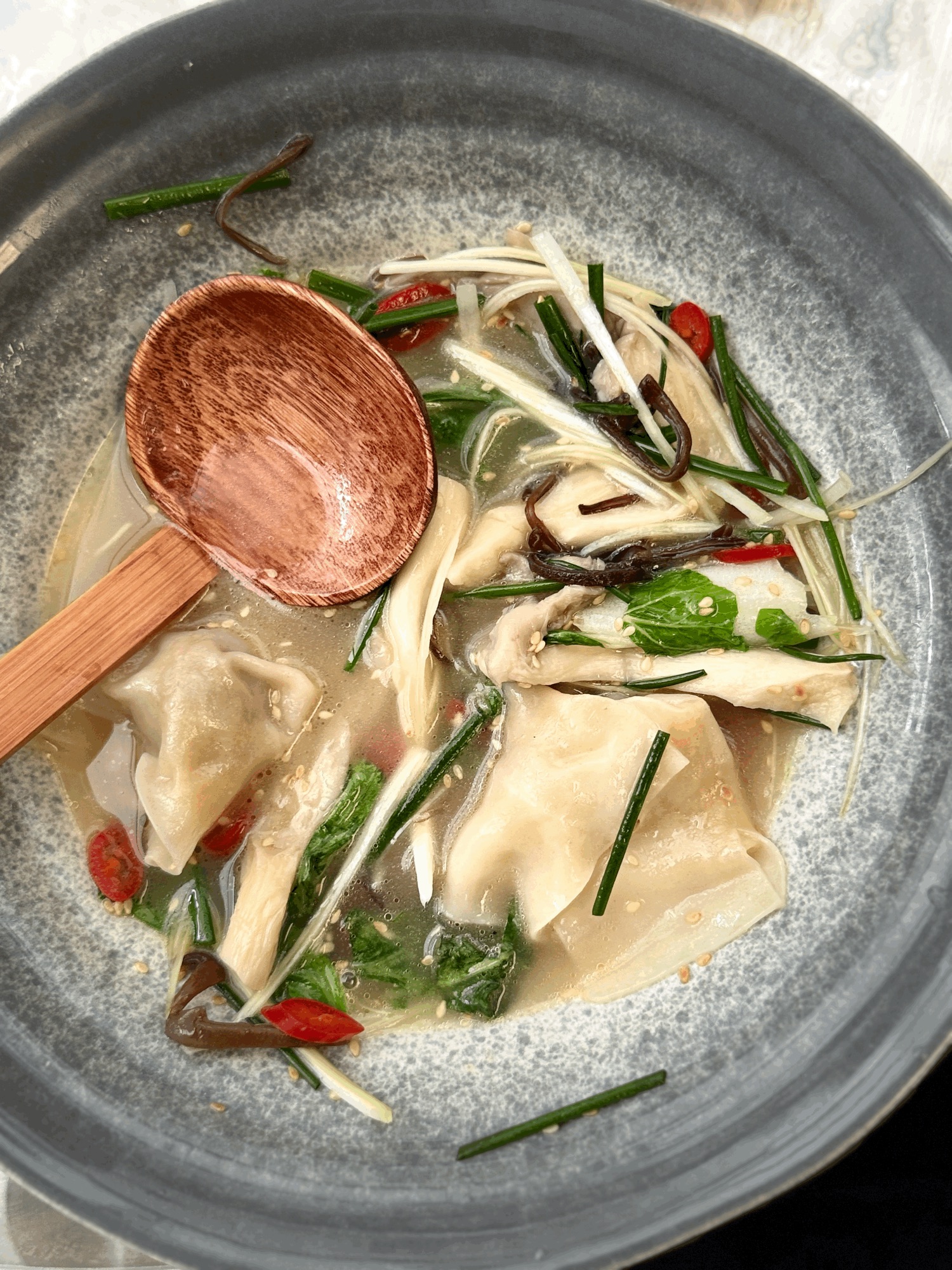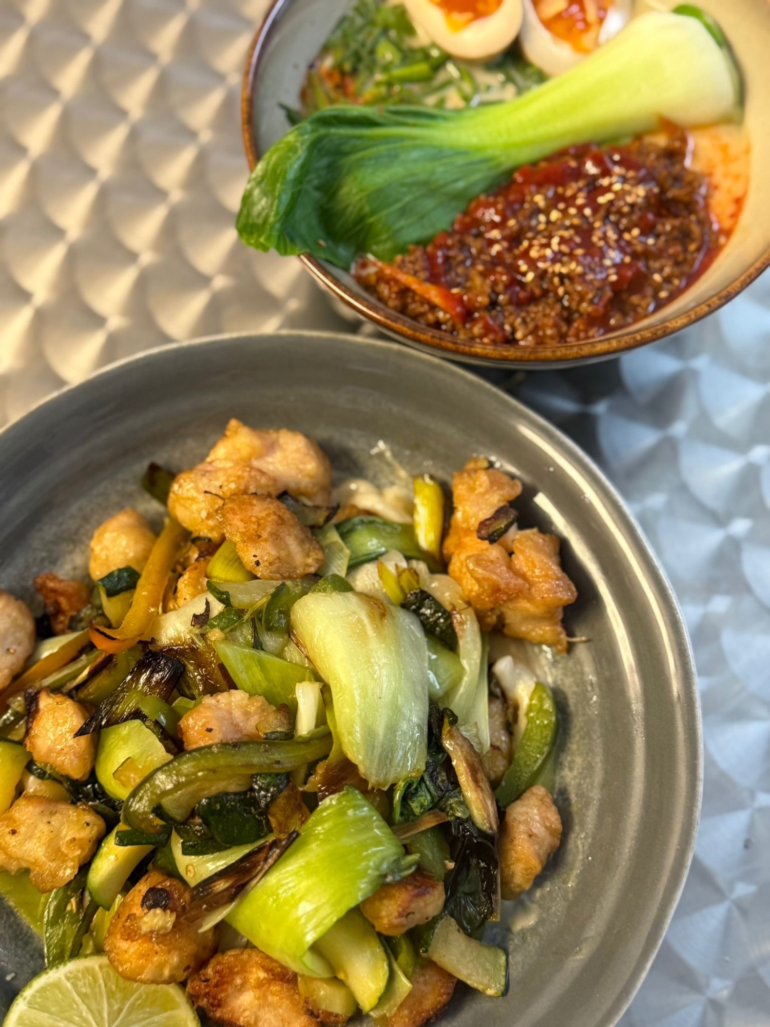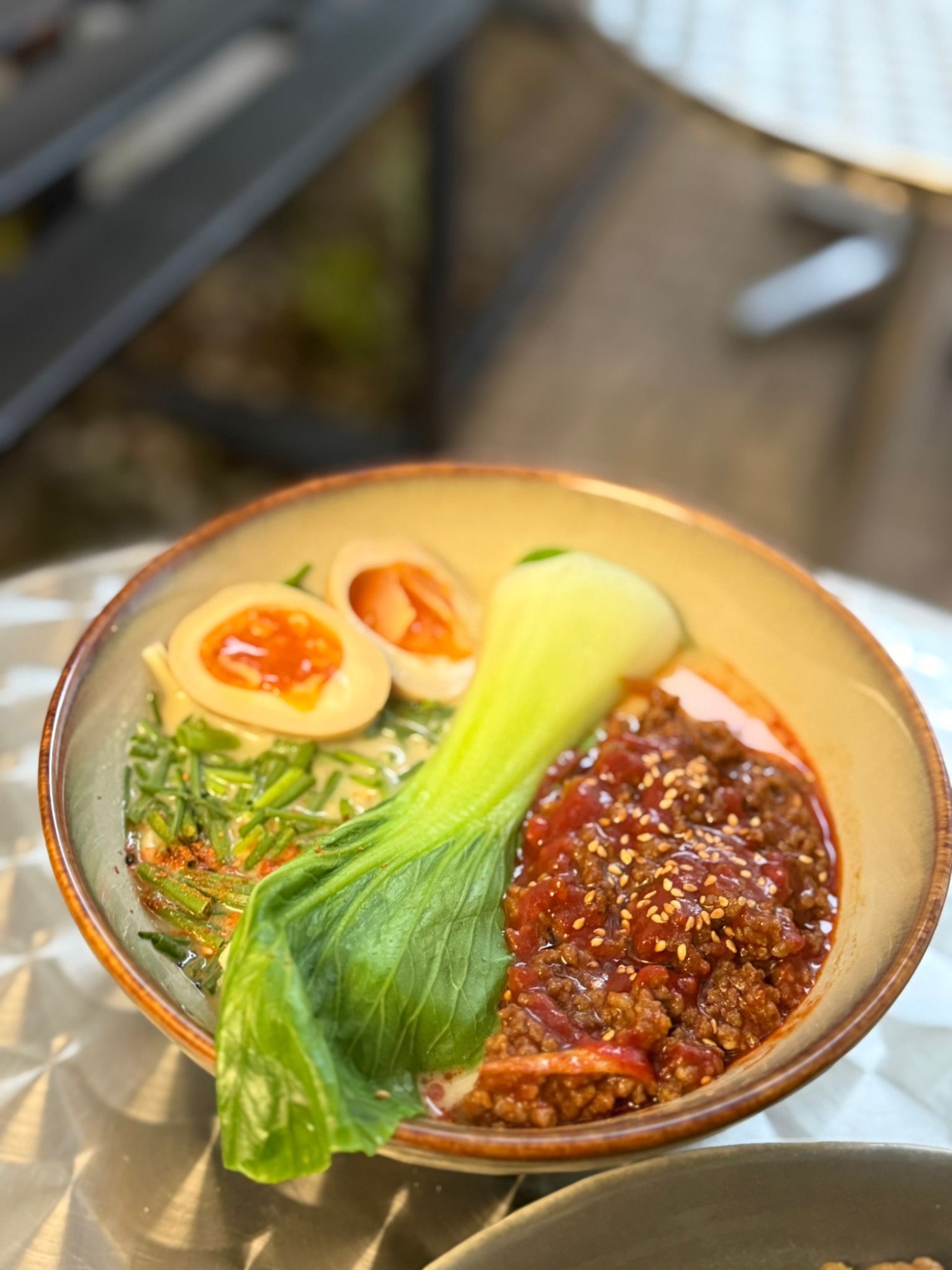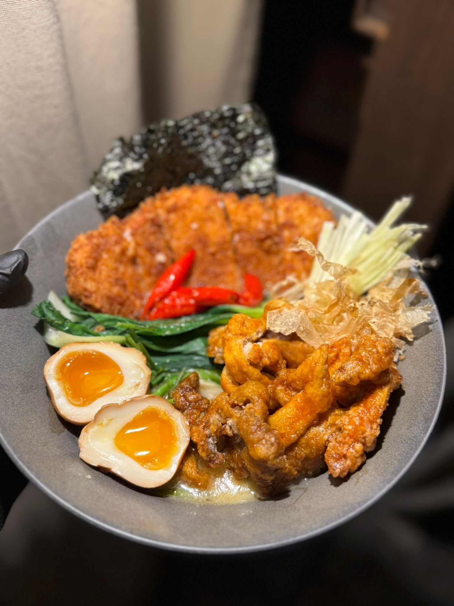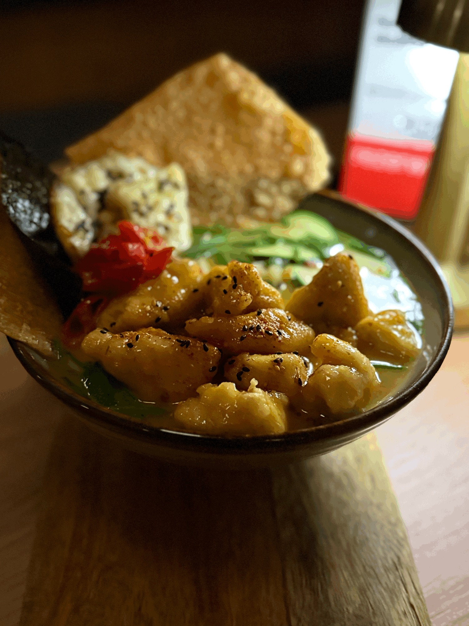 Tofu Deep Fry / Bulion Dashi / Ramen / Parzony Pak Choy / Parzony Boczniak / Szczypiorek / Kolendra / Por / Cukinia / Wodorosty Wakame