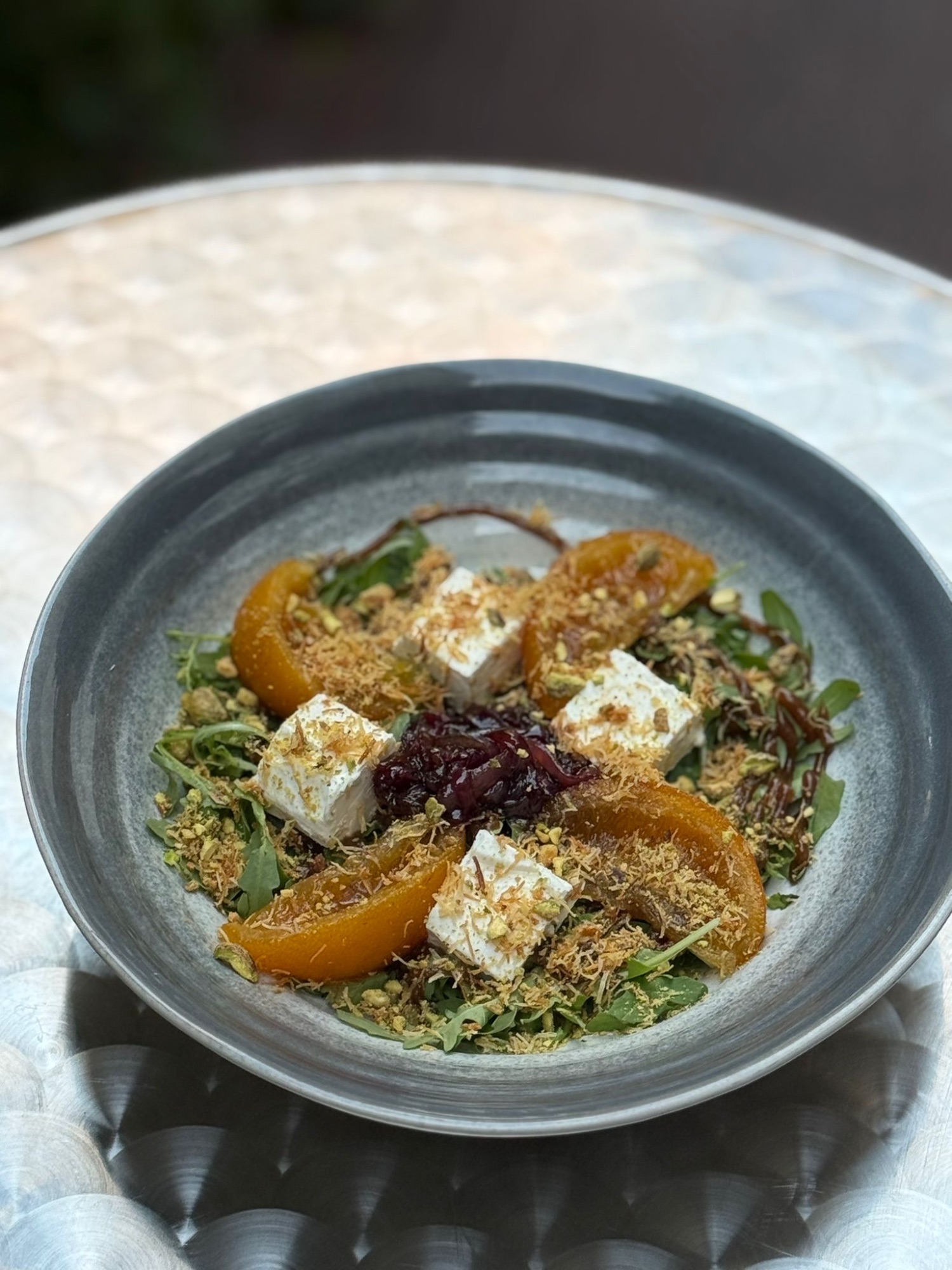 Pide / Sos Pomodoro / Pesto / Oliwa / Ser Kozi Manouri / Pomidory Suszone / Chilli / Liście Bazylii / Sumak / Chrupiące Nitki Kadaifi -