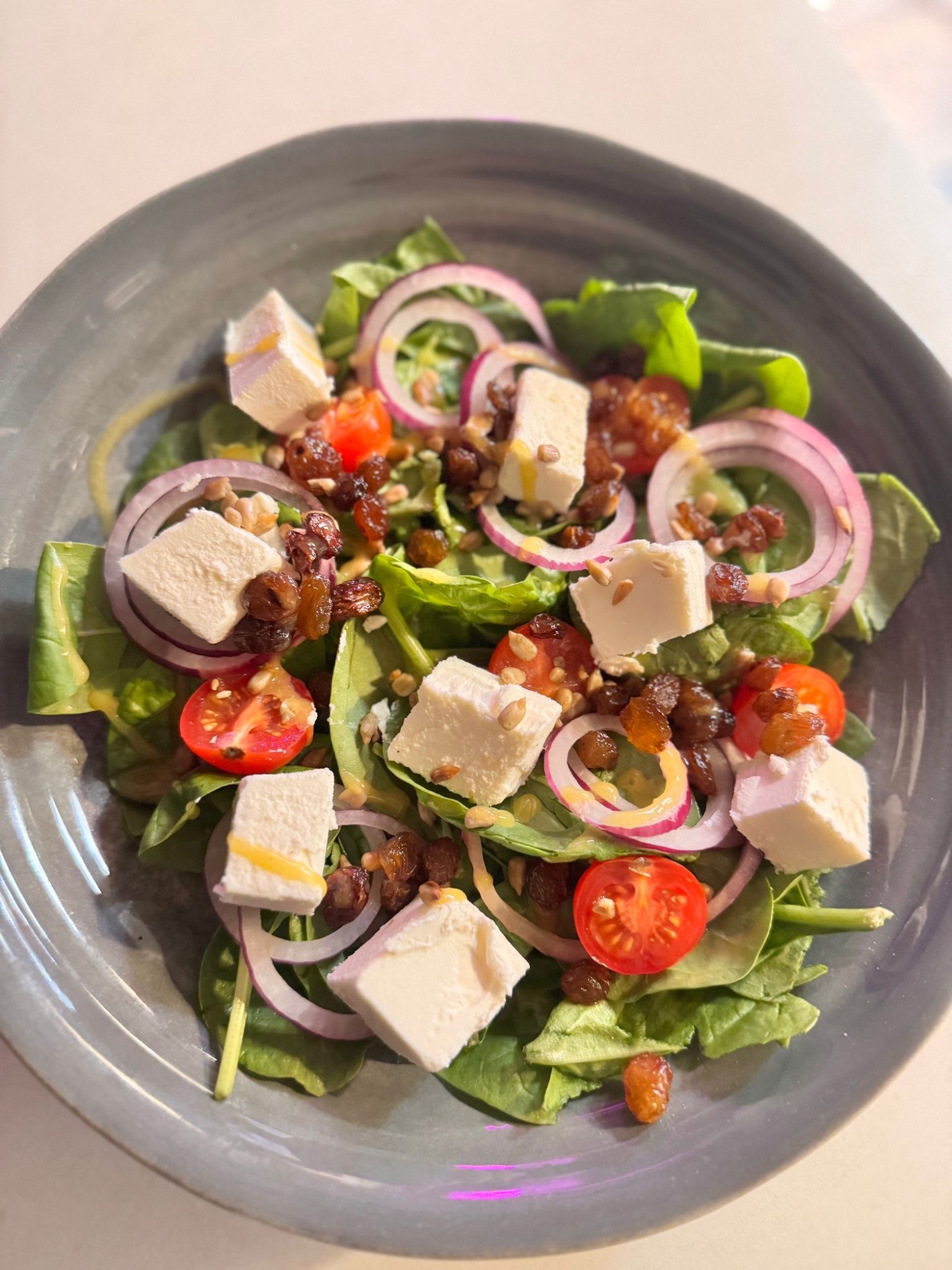 Kurczak / Sos Pomodoro / Mozzarella biała / Mascarpone / Szpinak / Suszone Pomidory / Rodzynki / Figi / Owoce Goiji / Czosnek / Kolendra prażona / Przyprawa Idris Powder