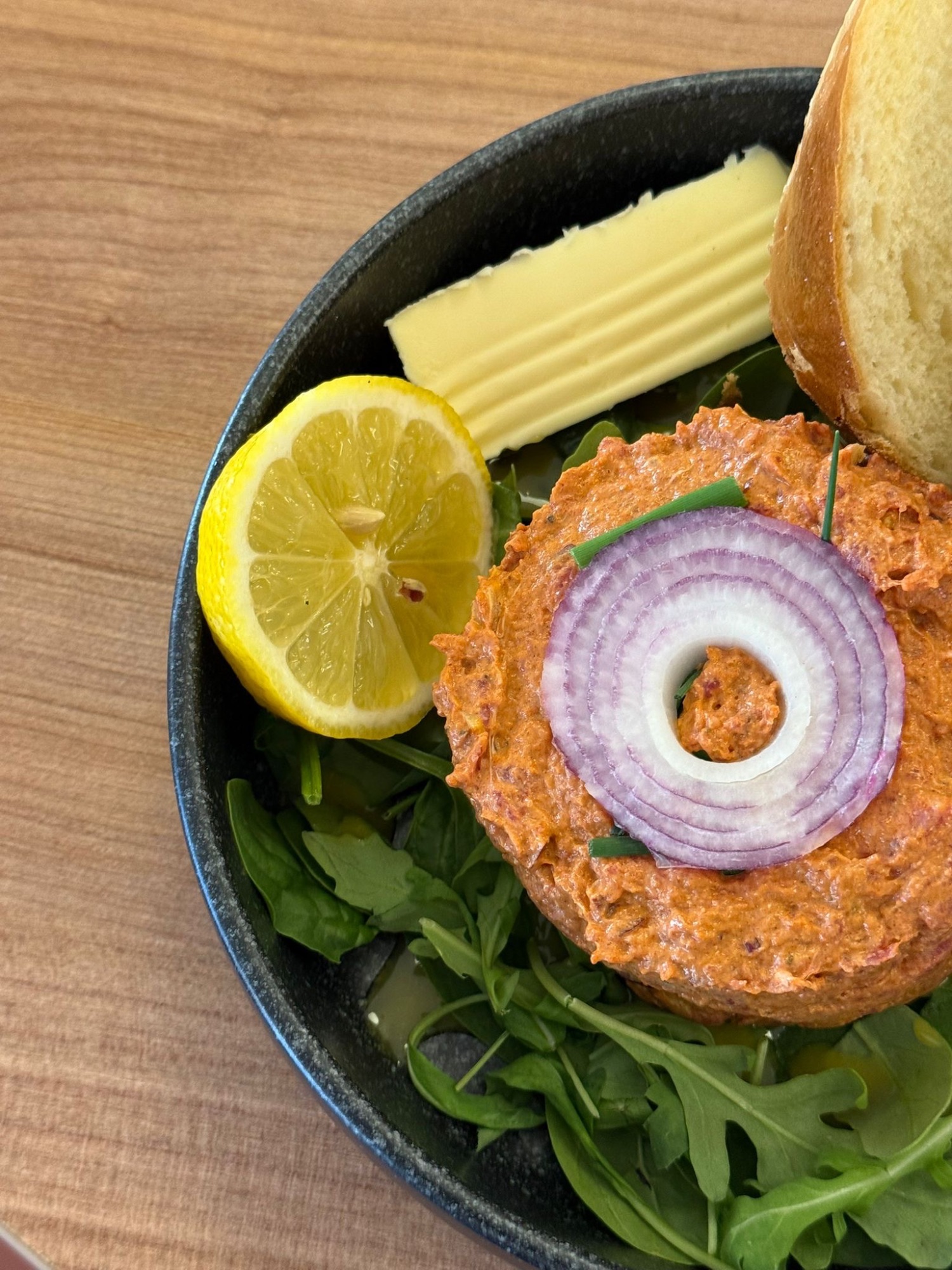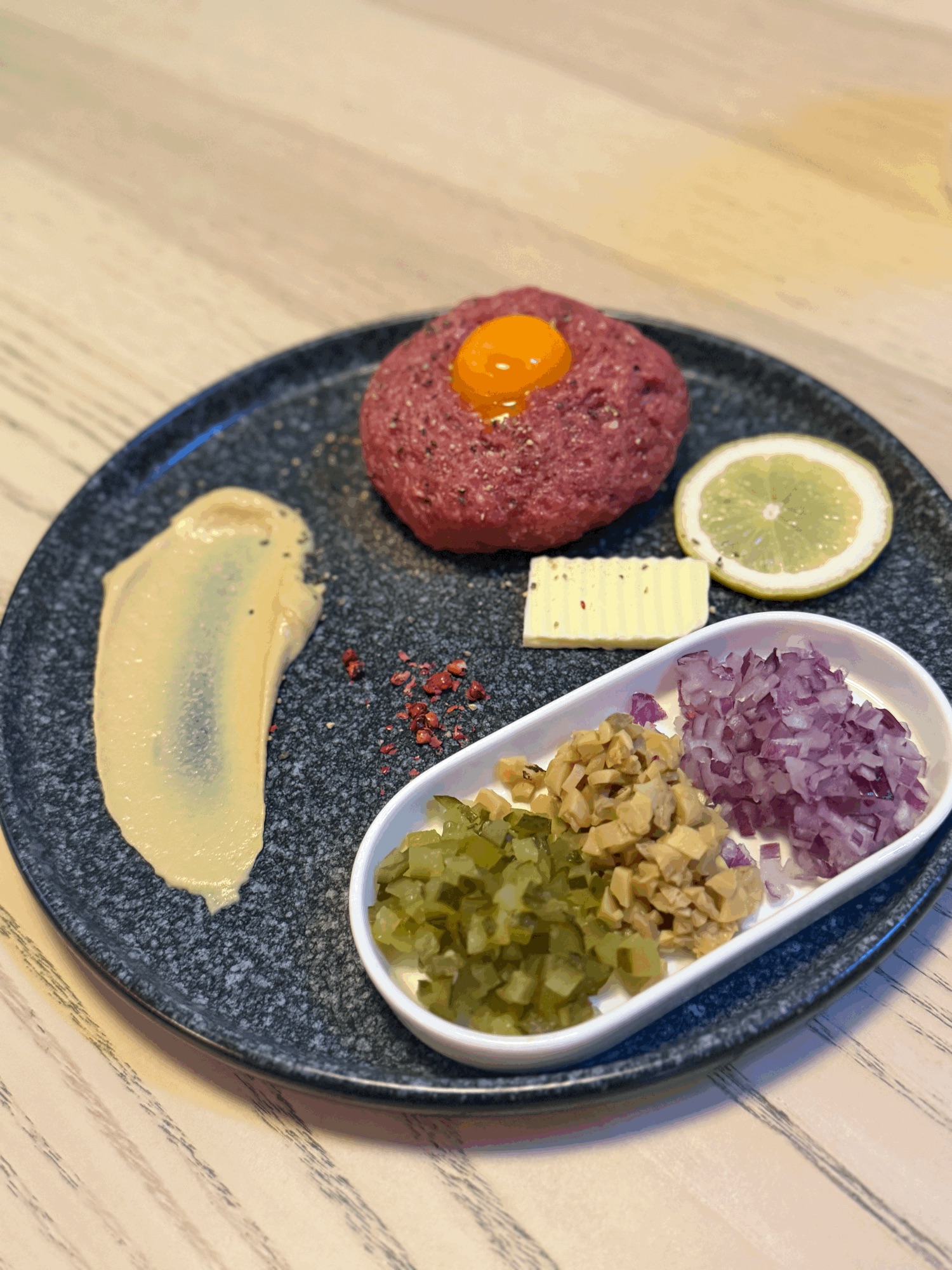 Surowa Wołowina / Mieszanka Przypraw Sabha Melange / Majonez / Czerwona Cebula z Oliwą i Sumakiem / Kolendra / Żółtko / Harissa Berberyjska / Porcja Masła Czosnkowego