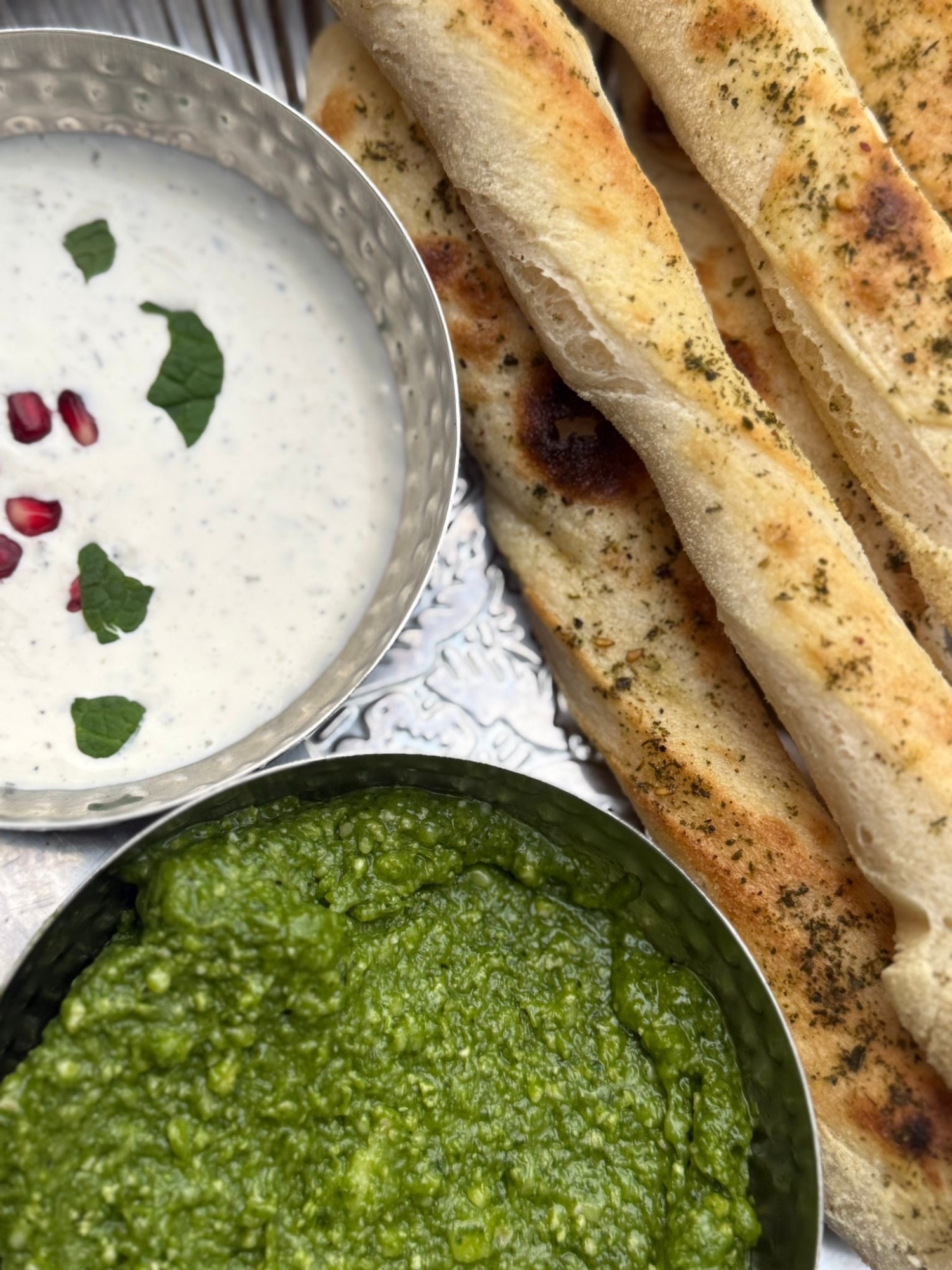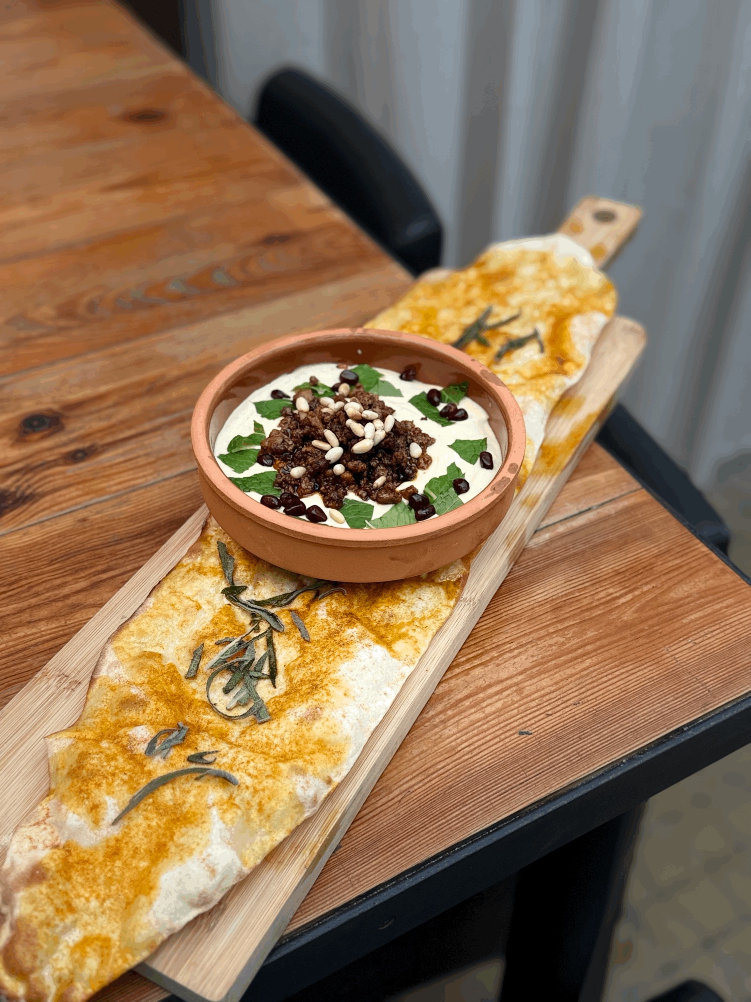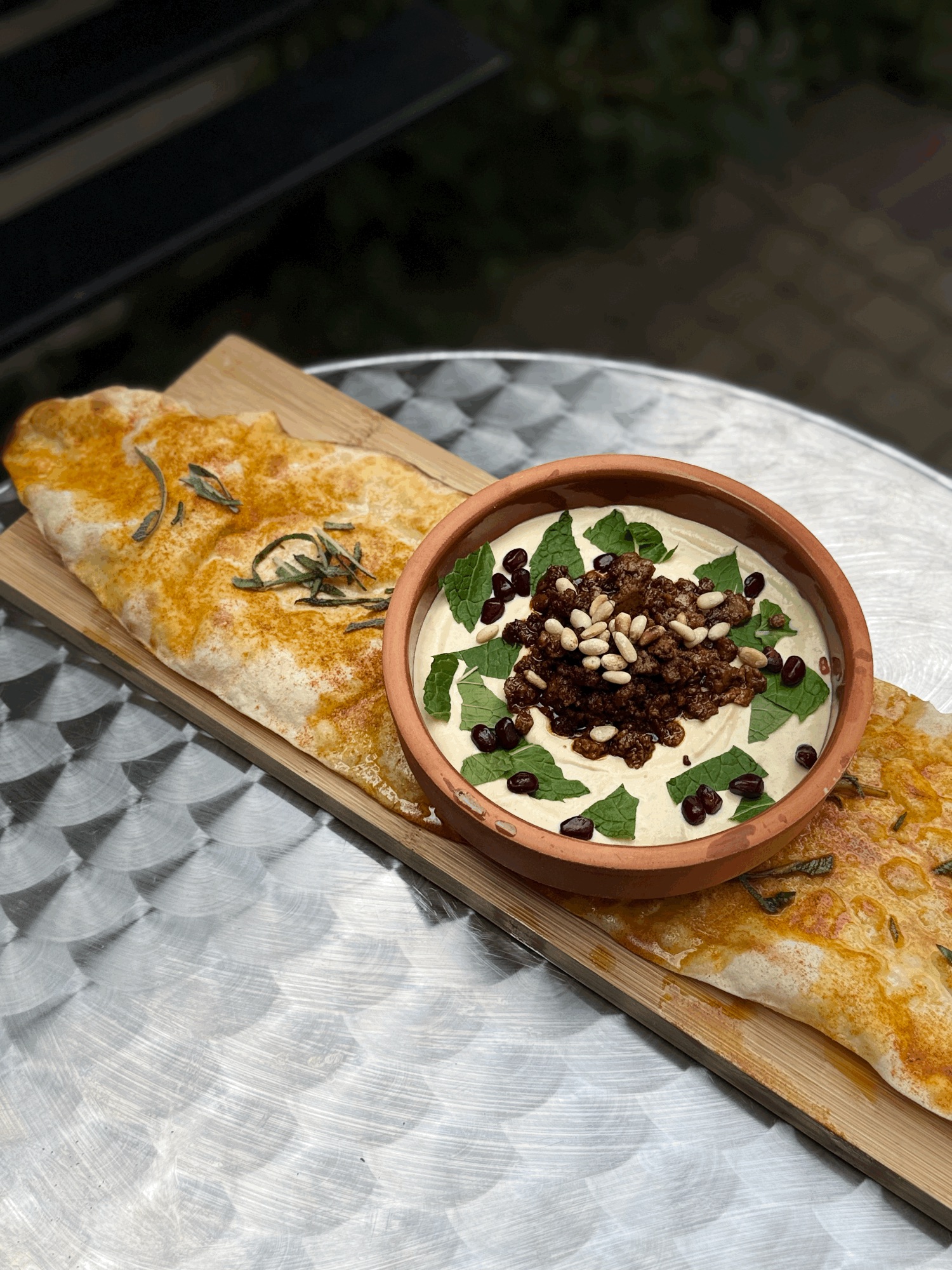 Pide / Sos Pomodoro / Mozzarella Fior Di Latte / Baranina Prażona Po Arabsku / Mascarpone / Oliwa / Sól i Pieprz / Orzechy Nerkowca Prażone / Rwane Liście Mięty / Pestki Granata -