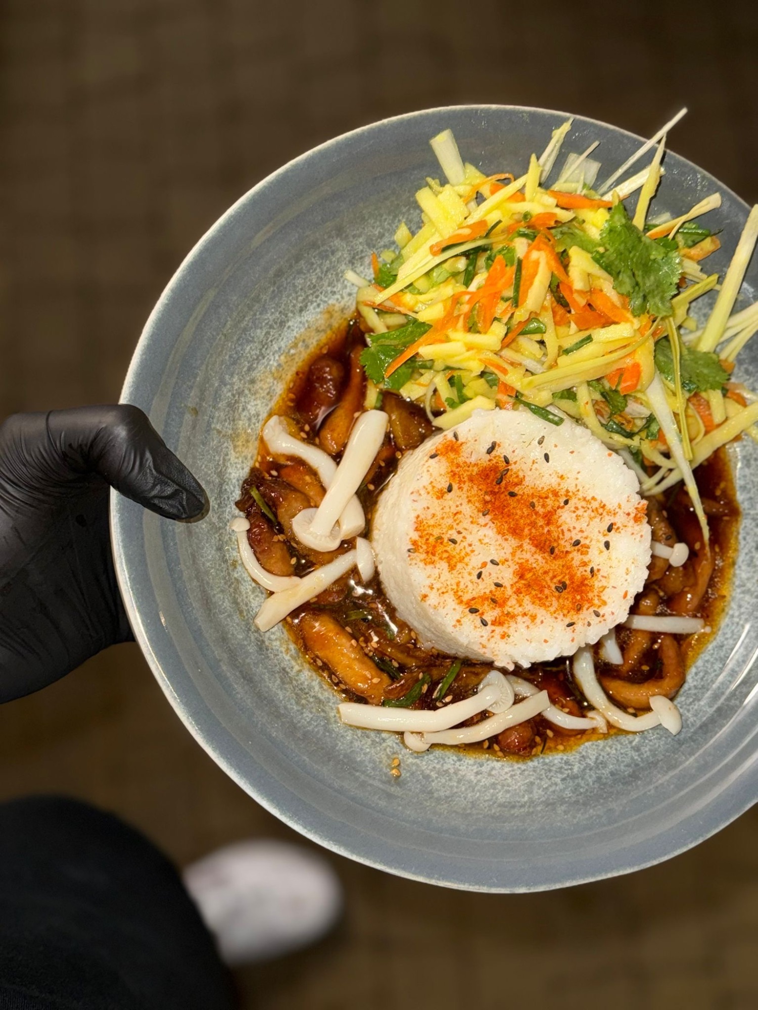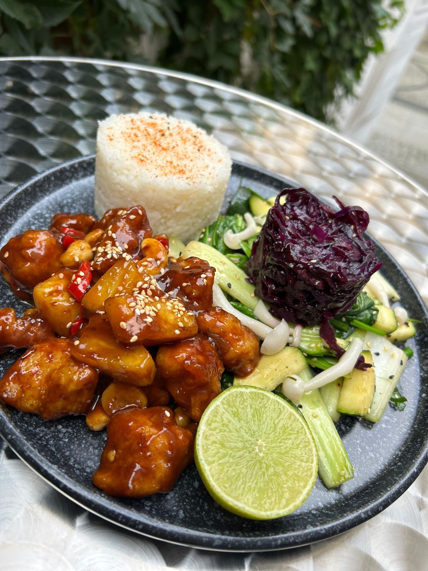 Cienkie, puszyste ciasto / Słodko-ostra Wołowina Taiwan Style / Sos czosnkowy / Limonka / Cebula Czerwona / Cebula Prażona / Szczypiorek